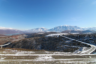 Ultra genis acili objektiflerin bir dezavantaji yukarida goruluyor: Kadraj! Yukaridaki fotografta kopek, gölgem, yol, kar, uzakta daglar, Allah ne verdiyse var. Fish-eye olsaydi kimbilir daha neler girecekti. Yani genis aciniz olunca kadraja neler girecegine iyi karar verin. Bu arada fotograftaki kopek ben manzara cekerken arkamdan haince yaklasti ve aniden havladi! O kadar korktum ki makineyi dusuruyordum. Bir sure bacaklarima surunup karsimda durdu, kosturdu, havladi, arabanin altina girdi. Bir-iki fotografini cekince sevindi (kuyruk sallama olayi) ve hemen yanimdan ayrilip soldaki tepeye kostu ve ulumaya basladi :) . Bazi dizi oyuncularindan daha yetenekli ve istekli oldugu kesin (Isim vermiyim, Polat'tan daha iyi rol yapabilecek dolaplar var. Aaa, vermisim)...